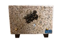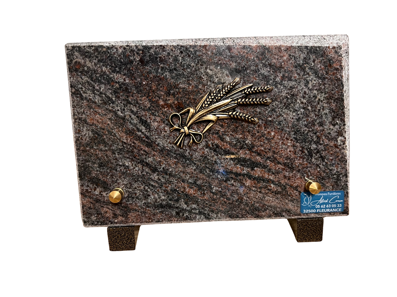 Plaque en granit Himalaya blue de forme rectangulaire avec motif bronze épi de blé. Dimensions 12 cm x 18 cm.