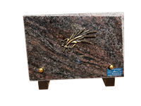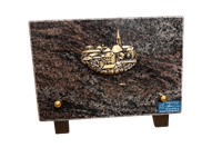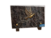 Plaque en granit mass blue de forme rectangulaire avec bronze motif colombe. Dimensions 12 cm x 18 cm.