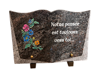 Plaque en granit Himalaya blue de forme livre rectangulaire avec motif gravure colorée bouquet de pensées et texte gravé en blanc. Dimensions 17 cm x 25 cm.
