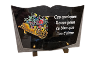 Plaque en granit noir fin en forme de livre rectangulaire avec motif brouette de fleurs coloré et texte gravé en blanc. Dimensions 17 cm x 25 cm.